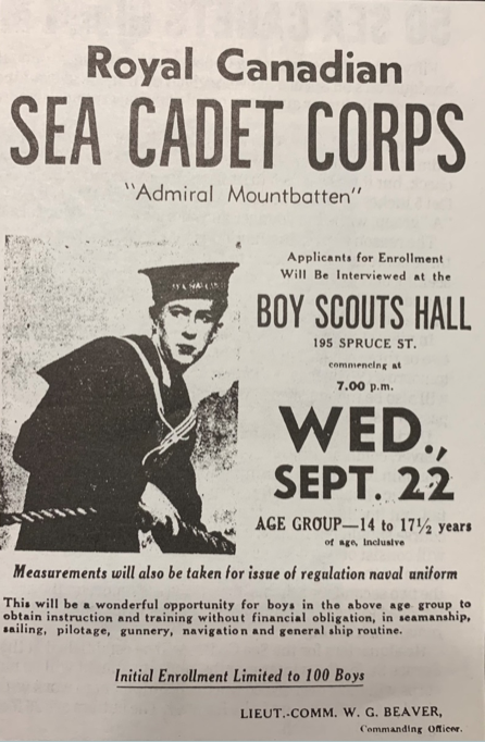 On the 22nd of September, 1943, 241 youths arrived at the Boy Scouts hall on Spruce St. in Sudbury for an opportunity to become members of RCSCC Admiral Mountbatten.